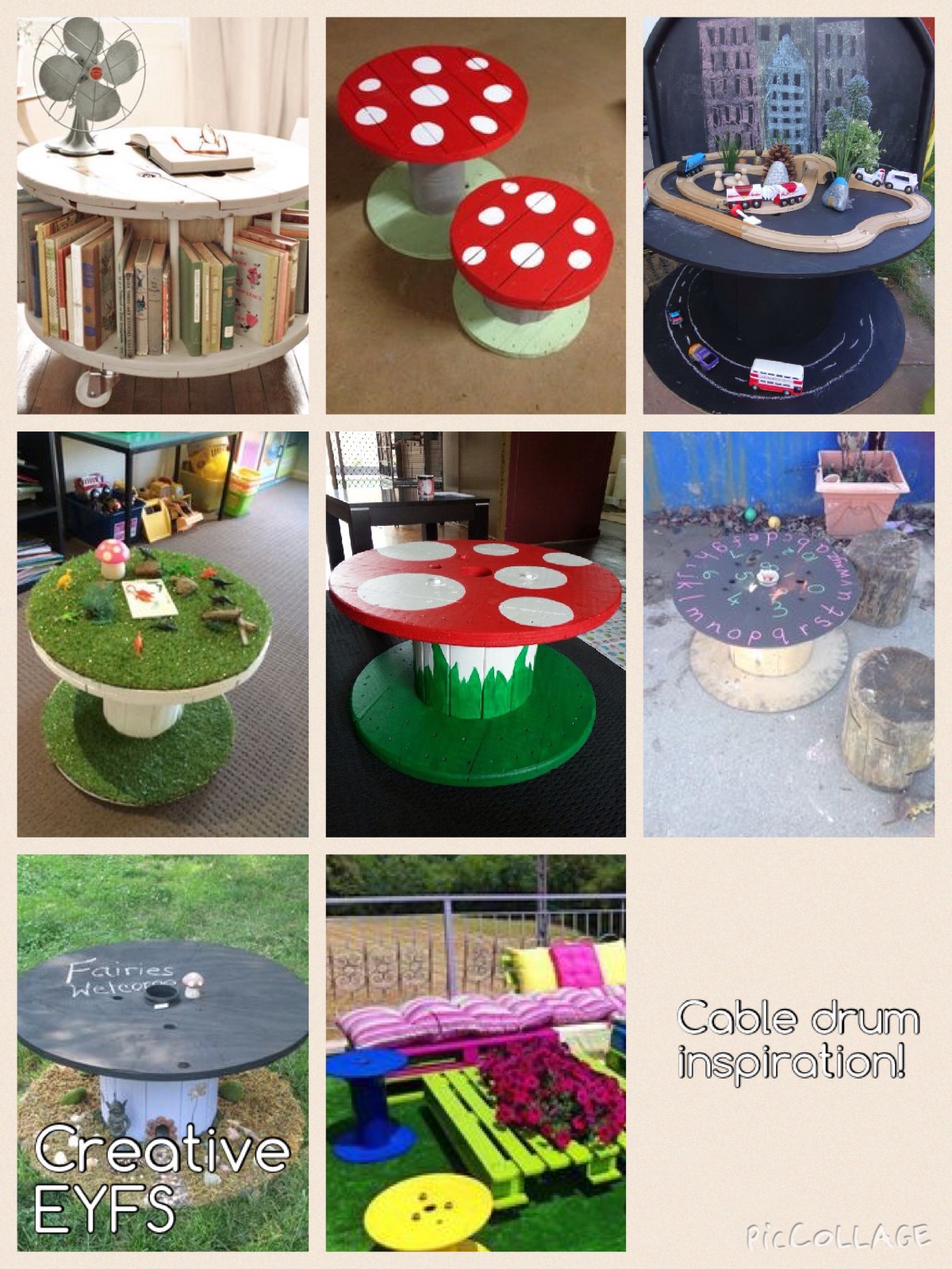 I have seen so many exciting ideas of how to transform cable drums into key pieces of furniture within learning environments. However so many people ask me where to get cable drums from, if you are lucky to have a friend who works and uses cables then that is great, however like me, that is not the case, so if you have building work going on over the holidays in school, ask your caretakers to save the cable drums that they use for electrical work! This was my stash from last year!